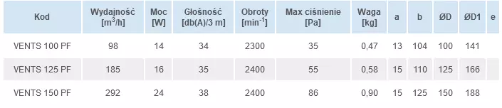Wentylator Osiowy Vents PF wykonany z plastiku, domowy, montaż sufitowy lub ścienny. Wentylatory wywiewne, zapewniające wysoki poziom komfortu, przeznaczone do wentylacji pomieszczeń mieszkalnych (łazienek, węzłów sanitarnych itp.). Wentylacja o wydajności do 292 m3/h. Przeznaczone do montażu w ciągach wentylacyjnych lub do łączenia z kanałami wentylacyjnymi Ø100, 125 oraz 150 mm. Okrągła konstrukcja tego wentylatora wyróżni go na tle zwyczajnych prostokątnych wentylatorów wyciągowych stosowanych w łazienkach.