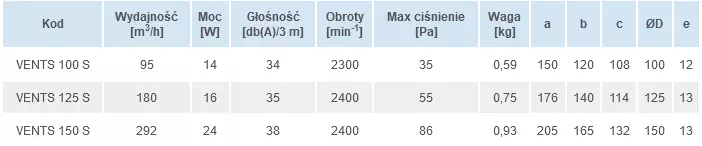 Wentylator Osiowy Vents S wykonany z plastiku, domowy, preferowany montaż ścienny lub opcjonalnie sufitowy. Wentylatory wywiewne, zapewniające wysoki poziom komfortu, przeznaczone do wentylacji pomieszczeń mieszkalnych (łazienek, węzłów sanitarnych itp.). Wentylacja o wydajności do 292 m3/h. Przeznaczone do montażu w ciągach wentylacyjnych lub do łączenia z kanałami wentylacyjnymi Ø100, 125 i 150 mm.