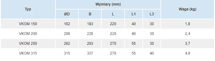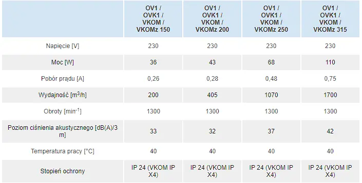 Obudowy wentylatorów VKOM, OV1, OVK1 wykonane są z blachy stalowej z powłoką polimerową. Obudowa wentylatora VKOMz wykonana jest z blachy ze stali ocynkowanej. Wirnik skrzydełkowy wykonany jest z blachy aluminiowej.