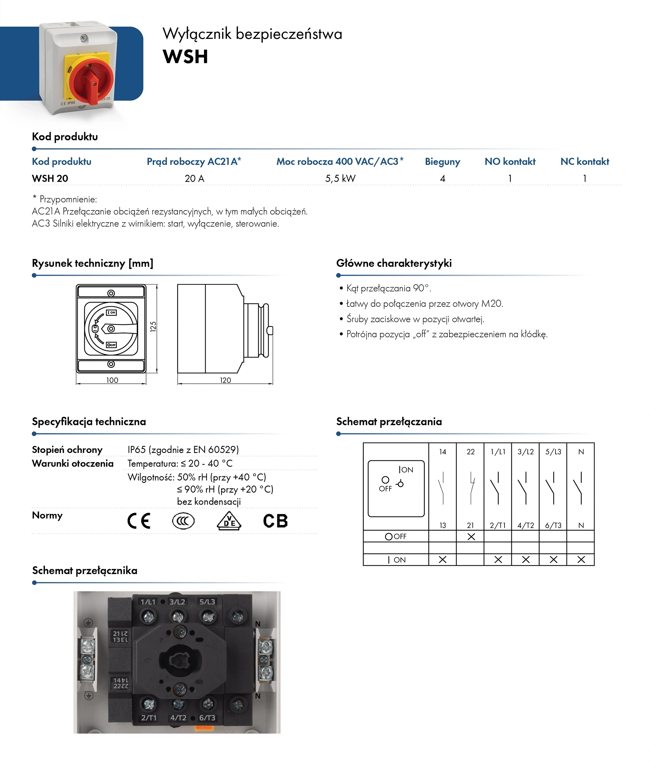 Wyłącznik serwisowy WŁ – WYŁ, 5,5 kW, 4P, 2 styki pomocnicze