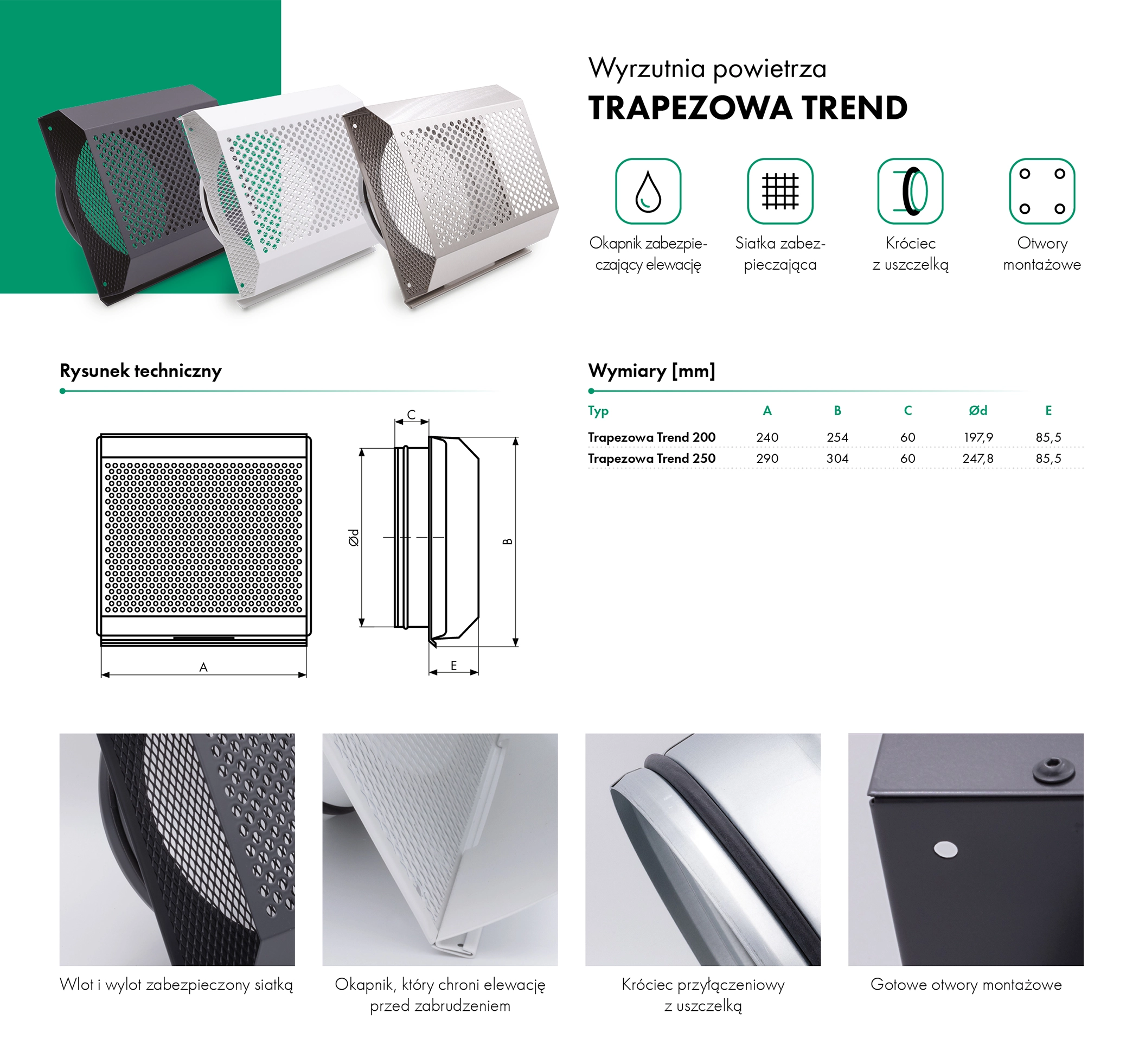 Konstrukcja trapezowa z okapnikem chroni elewację przed zabrudzeniami i zaciekami oraz wpływaniem wody opadowej do wewnątrz instalacji