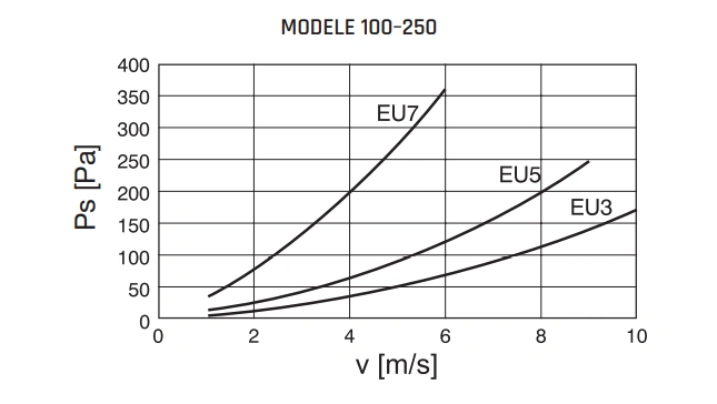 Zestaw DFK jest przystosowany do pracy z kieszeniowymi wkładami filtracyjnymi klasy EU3, EU5 oraz EU7 – wkłady te należy zamawiać oddzielnie, co pozwala dobrać odpowiednią klasę filtracji do konkretnego zastosowania. Wkład filtracyjny należy wymienić, gdy opory przepływu powietrza przekroczą poziom 250 Pa.