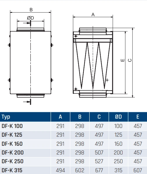 Zestaw filtracyjny DFK przystosowany jest do montażu w okrągłych kanałach wentylacyjnych o standardowych średnicach od 100 do 560 mm. Obudowa wykonana została z trwałej blachy ocynkowanej, co zapewnia odporność na korozję oraz umożliwia stosowanie w różnych warunkach środowiskowych – zarówno w instalacjach komercyjnych, jak i przemysłowych.