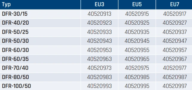 Wkłady filtracyjne dostępne dla zestawu DFR zapewniają wysoką skuteczność w zależności od wybranej klasy. EU3 to podstawowa ochrona przed większymi zanieczyszczeniami, idealna do standardowych instalacji. EU5 oraz EU7 oferują bardziej zaawansowaną filtrację, zalecaną w miejscach o wyższych wymaganiach czystości powietrza – takich jak obiekty służby zdrowia, laboratoria, kuchnie przemysłowe czy hale produkcyjne.