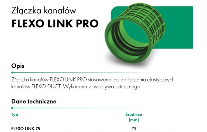 Złączka FLEXO LINK PRO pełni podstawową rolę przy łączeniu dwóch odcinków przewodów elastycznych z rodziny Flexo. Zapewnia to możliwość efektywnego przedłużania instalacji oraz dopasowywania jej do zmieniających się wymogów projektowych. Łączenie przy pomocy tego elementu jest szybkie i intuicyjne, dlatego produkt jest szczególnie ceniony w instalacjach wykonywanych na ograniczonej przestrzeni, w systemach prowadzących przewody pod posadzką, w sufitach podwieszanych lub w trudno dostępnych trasach wentylacyjnych.